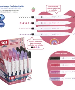 Inspirada nos pingentes e miçangas que estão em alta, a coleção Charm co nta com cores alegres e design divertido. É perfeita para customizar e c riar memórias especiais com os amigos! A caneta superfina com carimbo Ro llie traz mais praticidade para o seu dia-a-dia, sendo 2 em 1: caneta su perfina + carimbo roller, para decorar e escrever! Os carimbos possuem 4 estampas e a caneta possui ponta 0.4mm e está disponível em 4 cores!